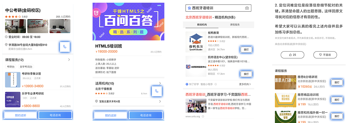 攜手教育機(jī)構(gòu)生產(chǎn)優(yōu)質(zhì)門店介紹、學(xué)習(xí)攻略、教學(xué)課程等內(nèi)容,實(shí)現(xiàn)結(jié)構(gòu)化信息呈現(xiàn),借助百度強(qiáng)大的AI技術(shù)能力,力求實(shí)現(xiàn)教育機(jī)構(gòu)和用戶需求的高效鏈接讓優(yōu)秀教育機(jī)構(gòu)獲客不再發(fā)愁